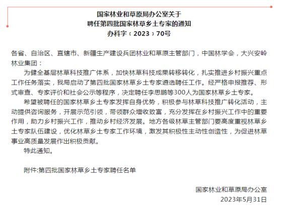 为健全基层林草科技推广体系,加快林草科技成果转移转化,扎实推进乡村振兴重点工作任务落实,2023年1月31日国家林业和草原局启动了第四批国家林草乡土专家遴选聘任工作。经严格申报推荐、形式审查、专家评价和社会公示等程序,2023年5月31日安徽龙眠山健康产业股份有限公司董事长袁凯同志被聘任为第四批国家林草乡土专家。